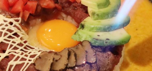 肉専門店の本気!トリュフ、雲丹、チーズを乗せた黒毛和牛ロングユッケ寿...