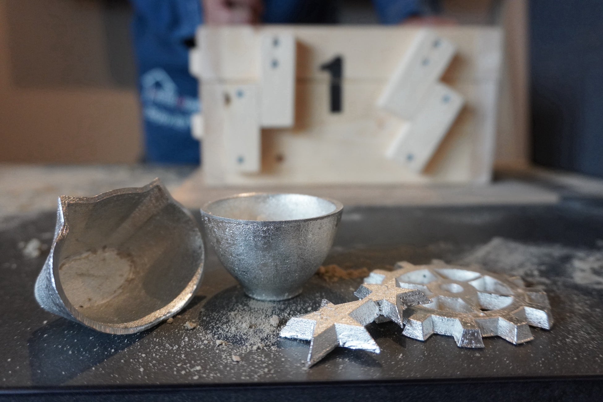 砂で鋳型を作り、そこに溶かしたスズを流し込んで作る本格的な鋳物製作が体験できる体験工房です。