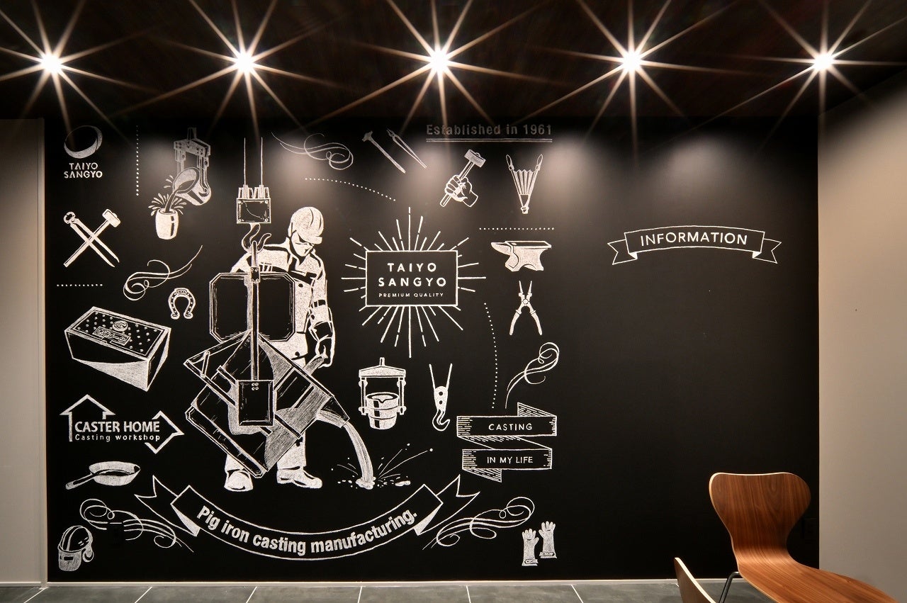 スタイリッシュな空間で鋳物製作を楽しんでいただいた後には、チョークアートの前で記念撮影も楽しめます。
