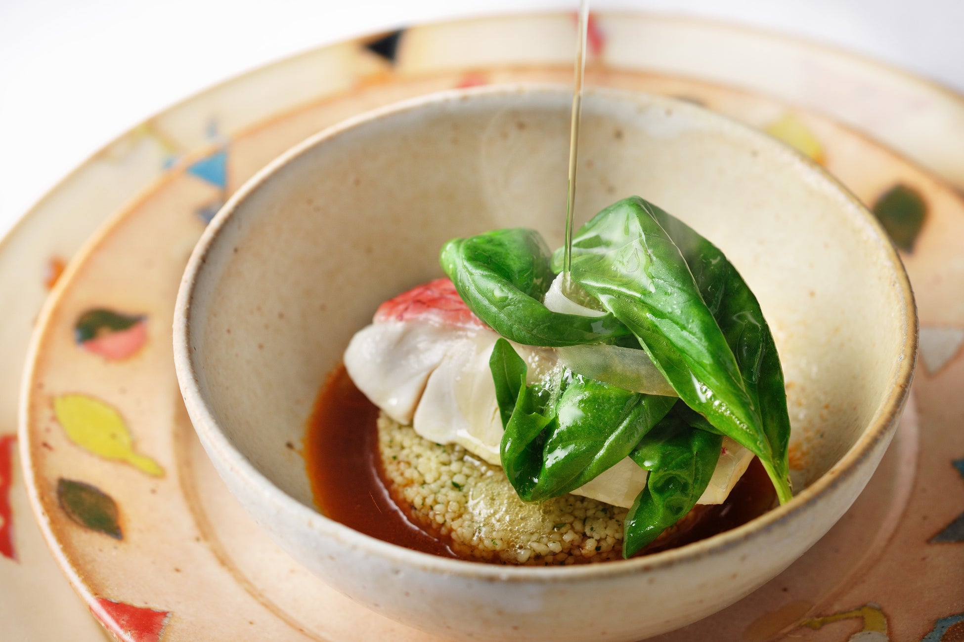 沖縄で三大高級魚とされる「アカマチ(ハマダイ)」は、アカマチとトマトの旨味たっぷりのスープを含ませた、クスクスと一緒に味わいます。上にどっさりとのせたバジルに、熱々の胡麻油を注ぎ入れれば、バジルのスパイシーな香りが立ち登り、食欲をそそります。