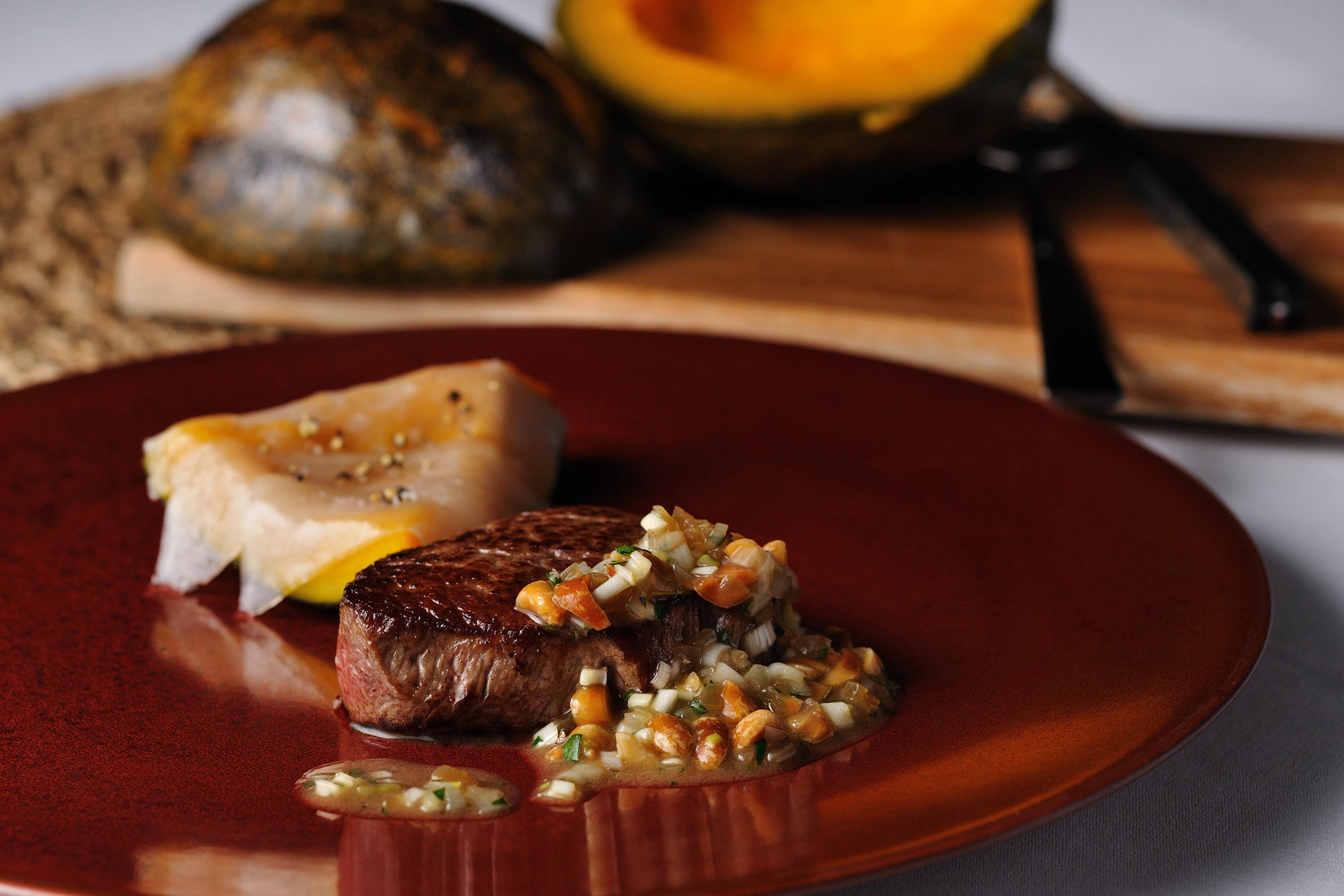 香ばしく焼き上げた肉厚の牛フィレ肉に、ソースには島らっきょうとパパイヤの黒糖漬けを合わせました。付け合わせは、沖縄特有のカボチャ「島カボチャ」をまるごと蒸し焼きし、沖縄料理でも馴染みの深い豚の脂肪(ラルド)をあわせ、柔らかくねっとりとしたカボチャと濃厚な旨味を楽しみます。
