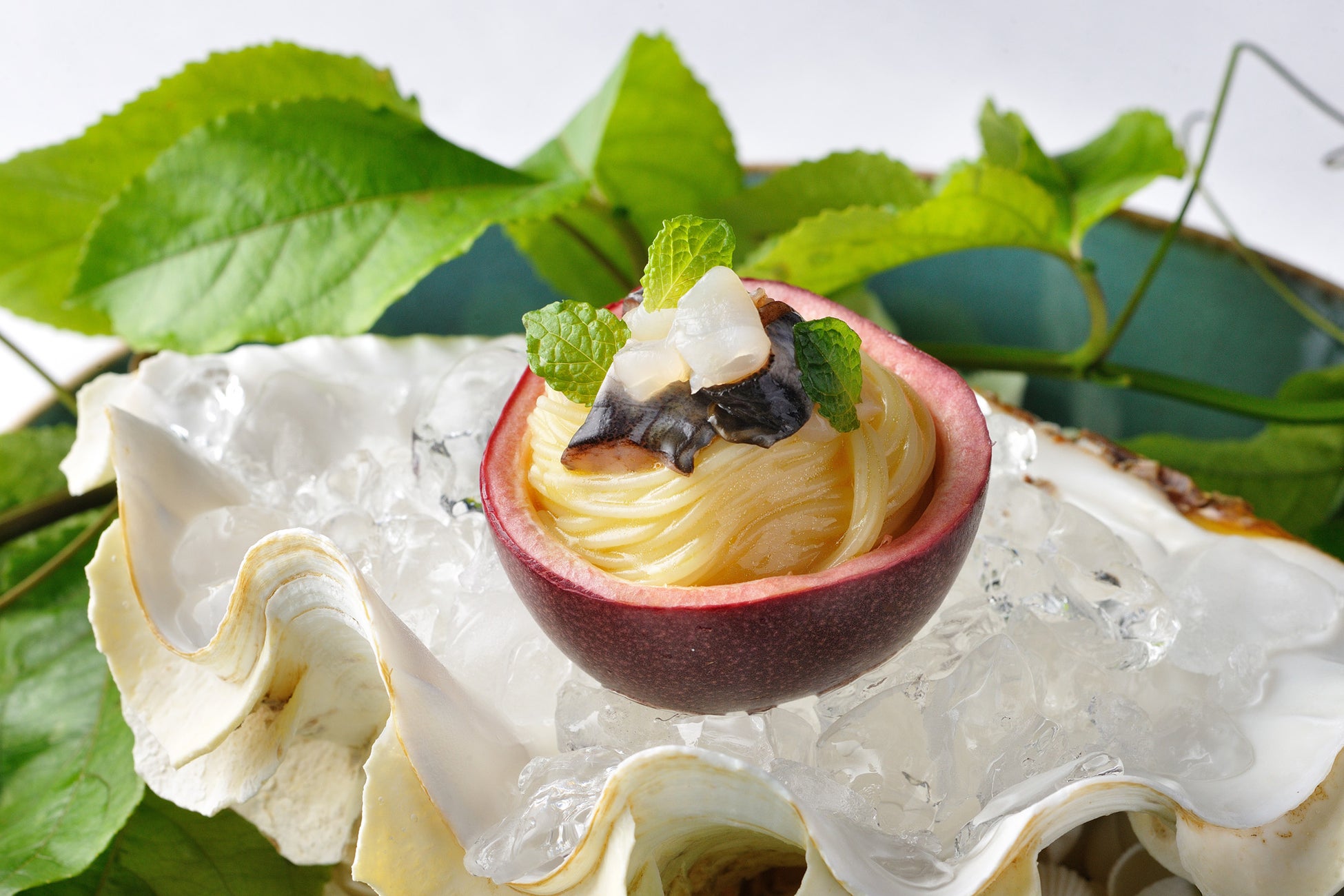 極細のパスタに、貝を煮詰めた濃厚なスープと、古代ローマ時代に生まれた魚醤「コラトゥーラ」と「シャコガイ」を合わせ、ソースには爽やかな甘みと酸味をもつパッションフルーツを使用しました。シャコガイのコリコリとした食感も楽しい、前菜として楽しむ小さな冷前菜です。