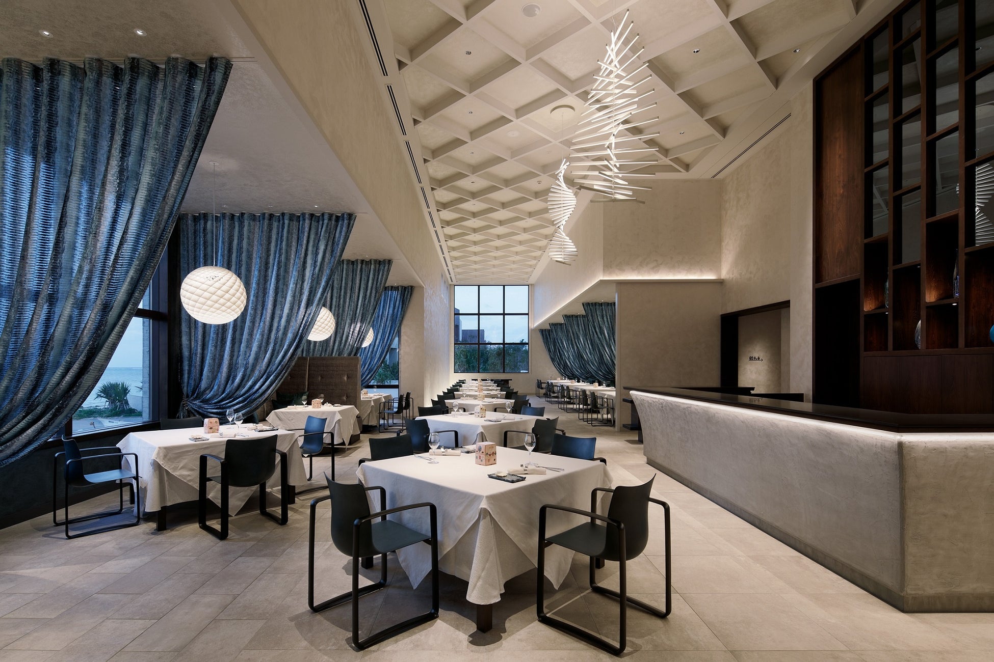 高さ5mの天井が生み出す開放的な空間が広がり、海と白い砂浜を連想させる、青と白を基調とした内装。青い壁の塗料にはわずかにシルバーを混ぜ、海中を泳ぐ小魚や水面の光を表現。白い壁には砂粒ほどの大きさの骨材を混ぜ、自然な風合いを出しました。海のすぐ側にありながら窓を全てオープンにせず、海の存在を感じながらもテーブルの上に意識を向ける。沖縄の食材とシチリア料理の出会いを、ゆっくり楽しめる空間を用意しています。