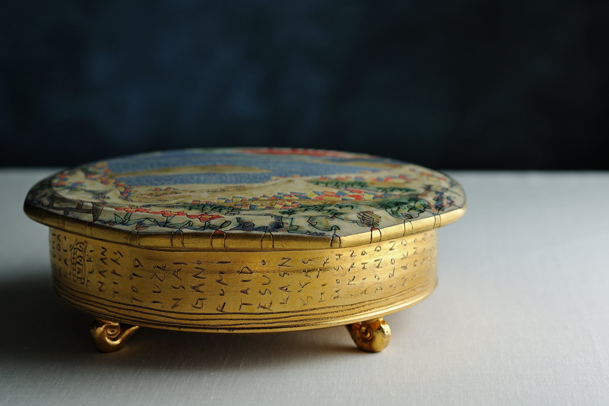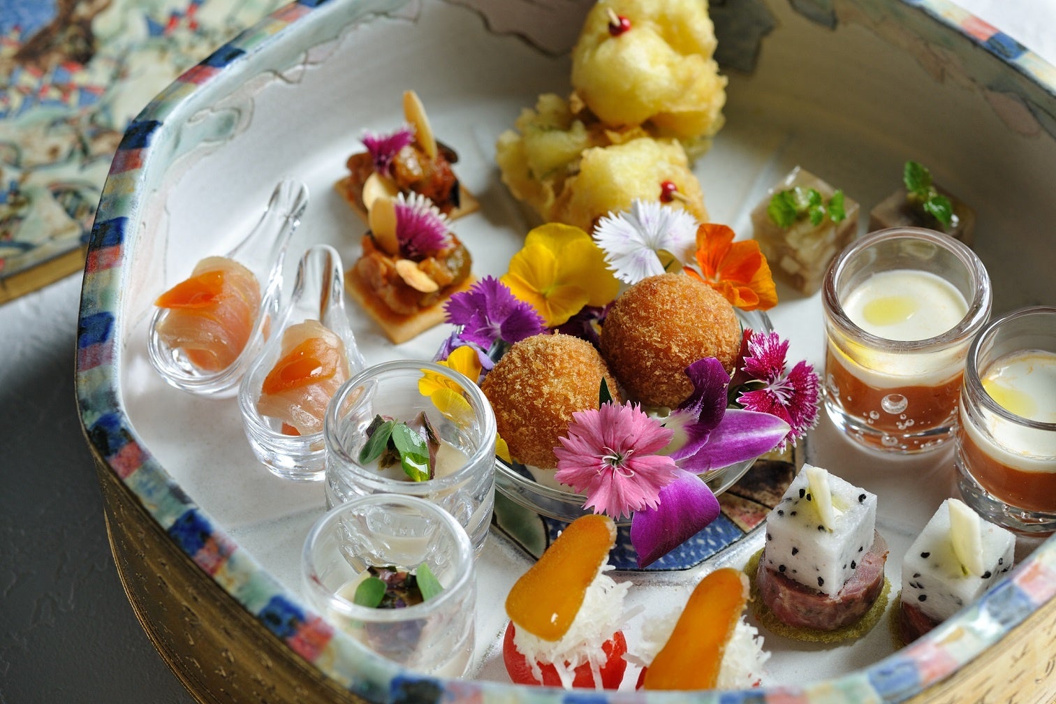 前菜で登場する蓋つきの器は、琉球で大切なお客様をもてなす際に使われていた器「東道盆(とぅんだーぶん)」をモチーフに、星のや沖縄が独自にオーダーしました。蓋の表にはシチリアの街と沖縄の海と太陽を、裏にはシチリア語や日本語を織り交ぜた文字を模様のように散りばめて、シチリアと沖縄の要素が融合した「琉球シチリアーナ」を表現しています。その他にも、カラフルでポップなデザインでシチリアの海や対応を想起させる器や、強くもどこか異国情緒をまとったマットで気品のあるものなど、「琉球シチリアーナ」のコンセプトをより鮮やかに表現する、沖縄とシチリア双方の要素を取り入れた器を使用しています。