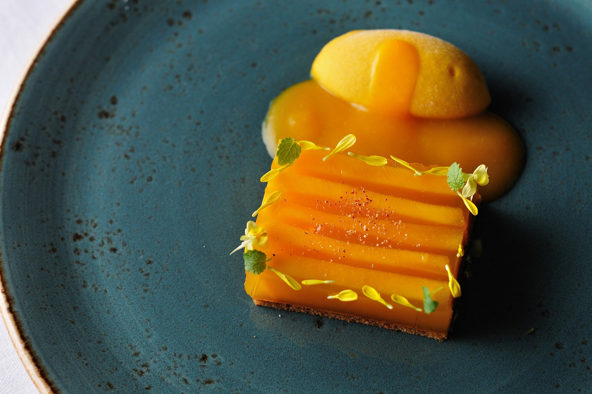 柔らかく熟したマンゴーの果肉と酸味を活かした軽やかなマンゴーのゼリーを重ねたテリーヌ仕立てのデザート。アイスクリームやソースにもマンゴーをふんだんに使い、旬のマンゴーを堪能するひと皿です。仕上げは、島胡椒と呼ばれる「ピパーチ」と島唐辛子をかけ、スパイシーな香りと味わいがマンゴーの旨味を引き立てます。