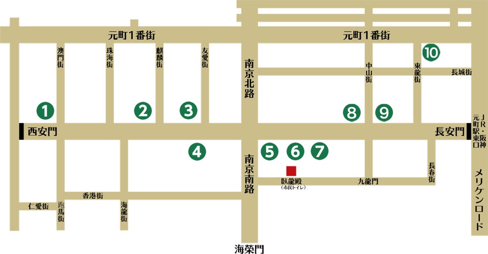❶上海飯店 ❷朋栄 ❸中華的射的場 ❹ミズ倶楽部センター ❺堂記號