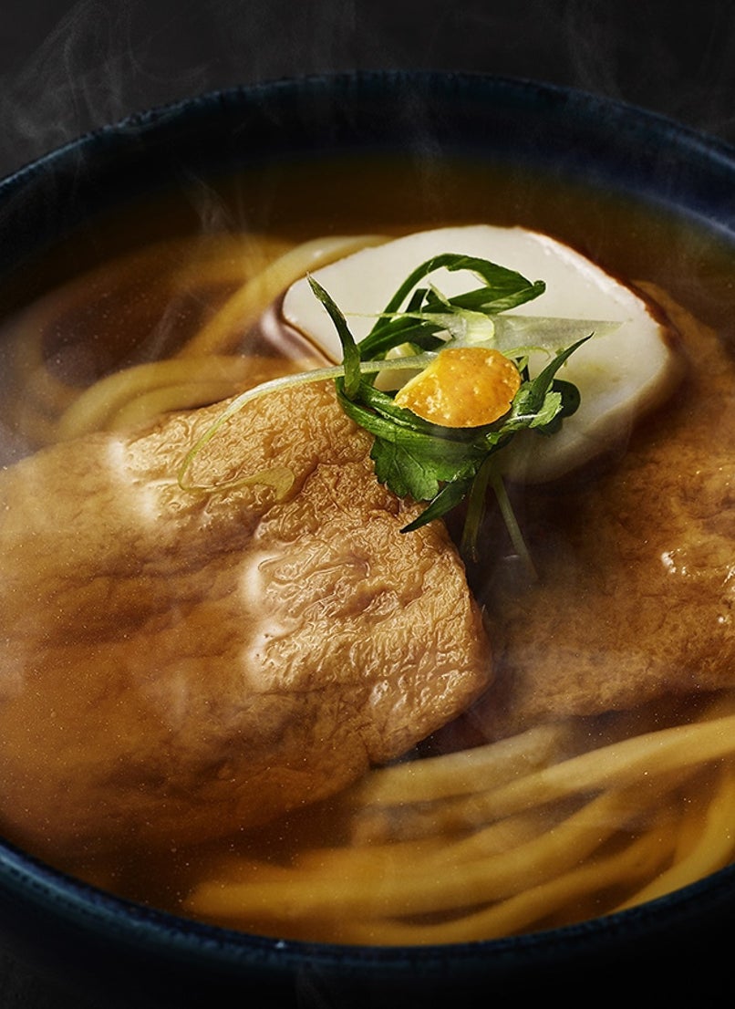 柔らかく、もっちりとしていて断面は丸いのが特徴。角が丸いのは「角を立てずに丸く収める」という大阪商人独特の発想とも言われます。また、角が丸いことで出汁と絡みやすく、ツルッと喉越しも良い。お子様から高齢者まで食べやすい麺。
