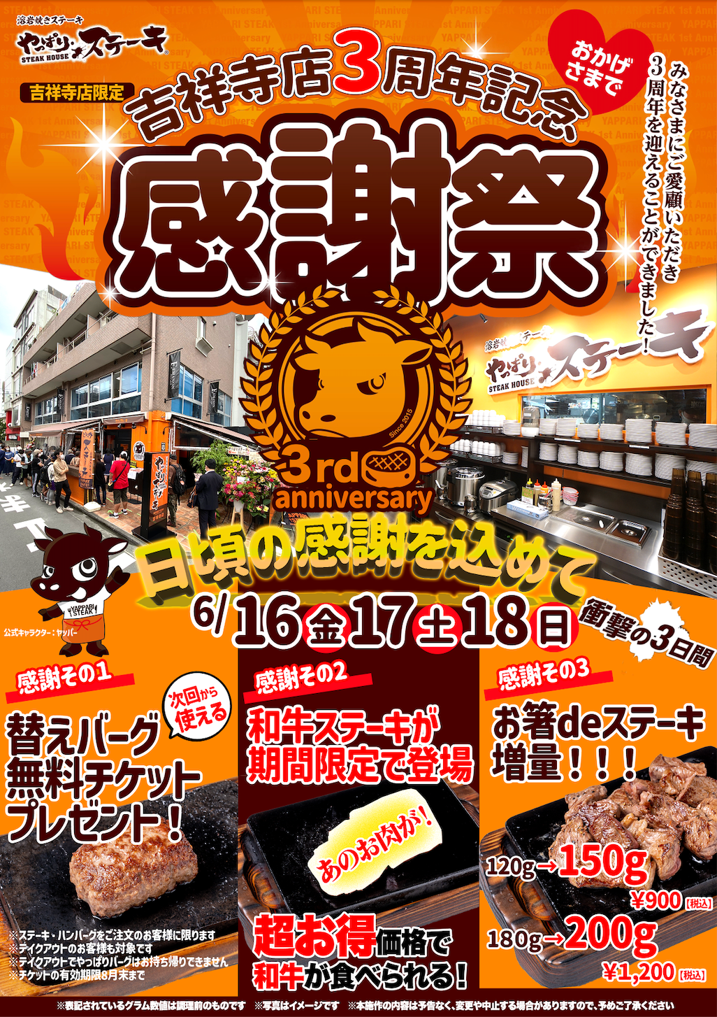 やっぱりステーキ吉祥寺店がOPENしてからおかげさまで3年が経ちました。