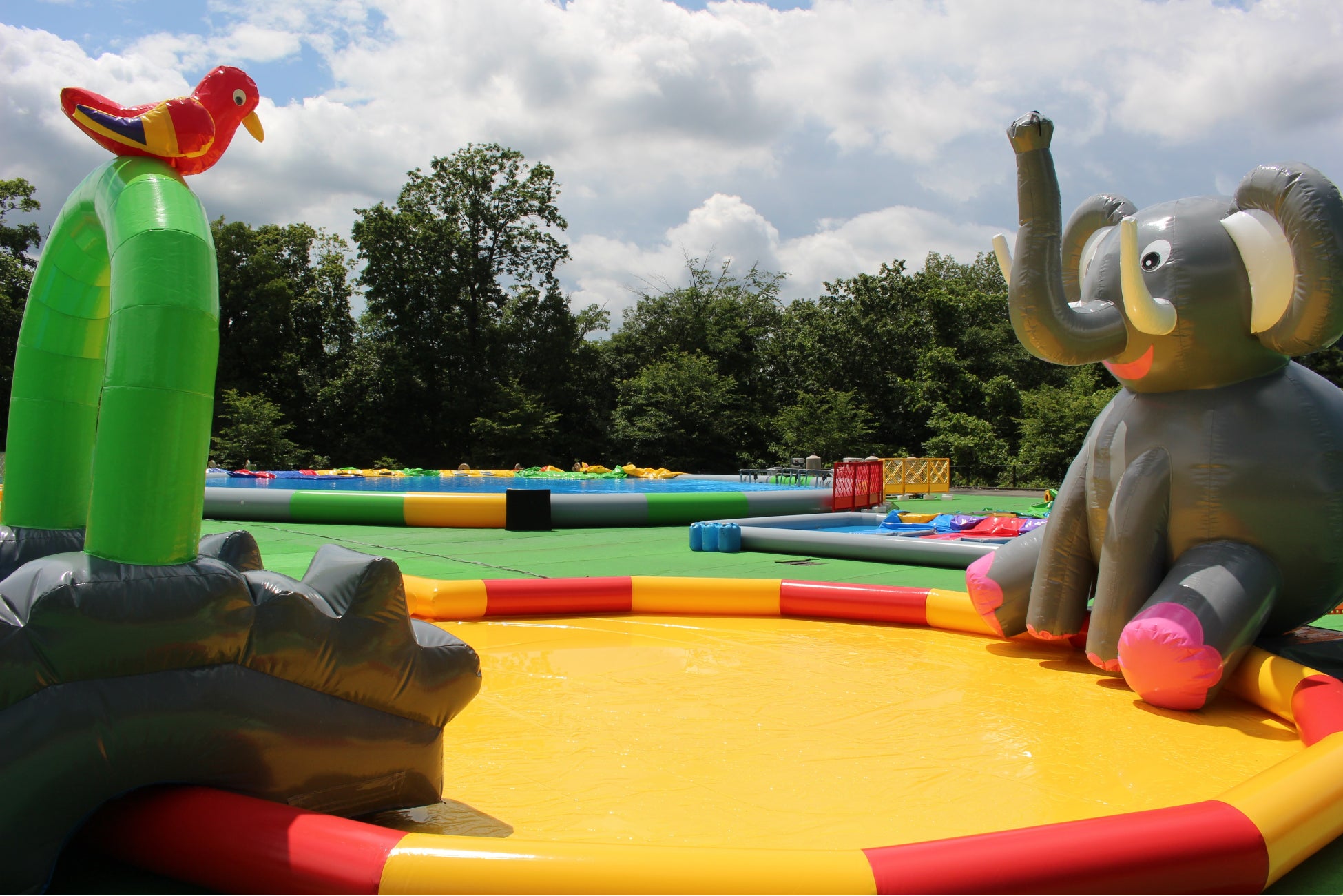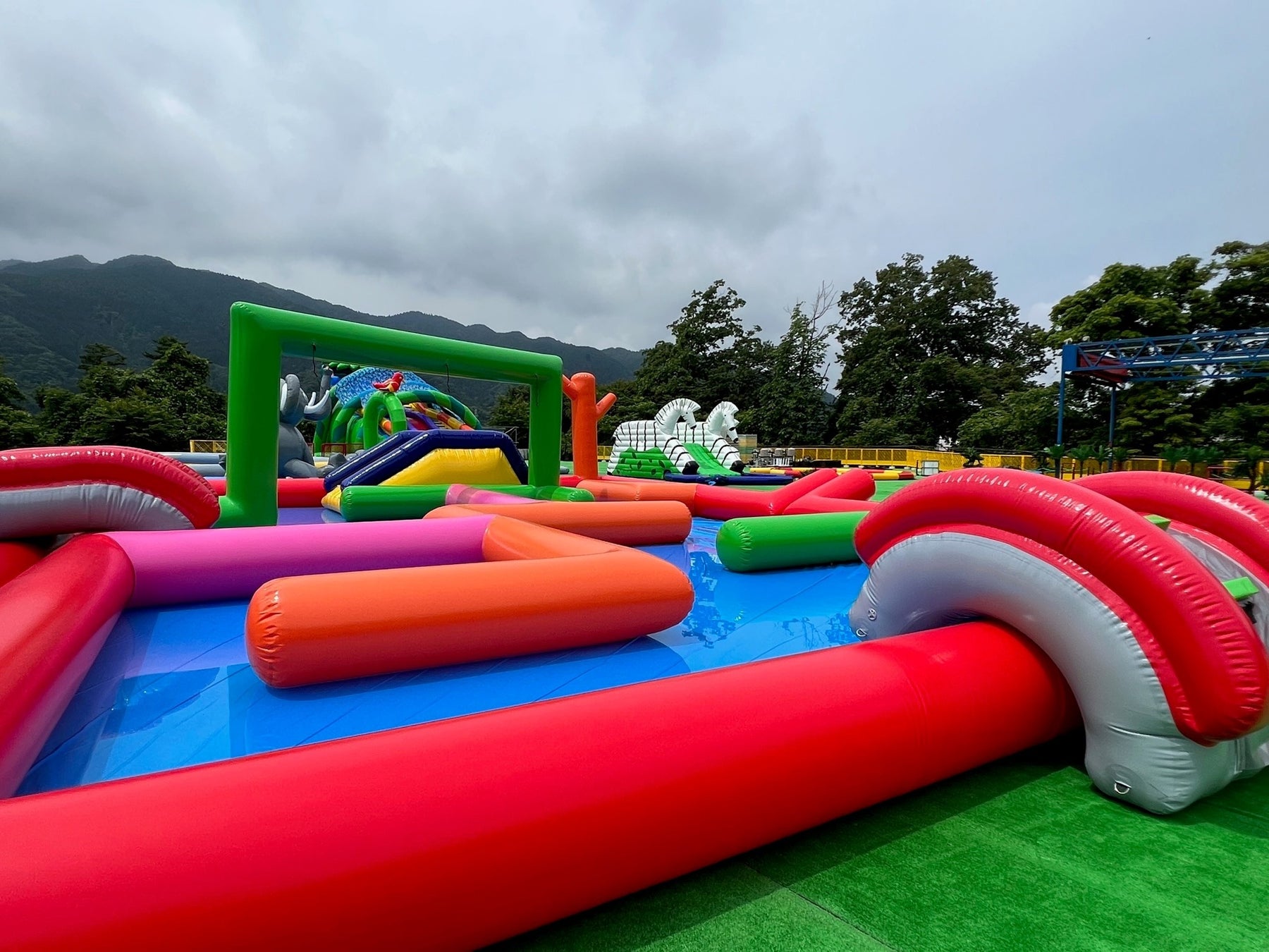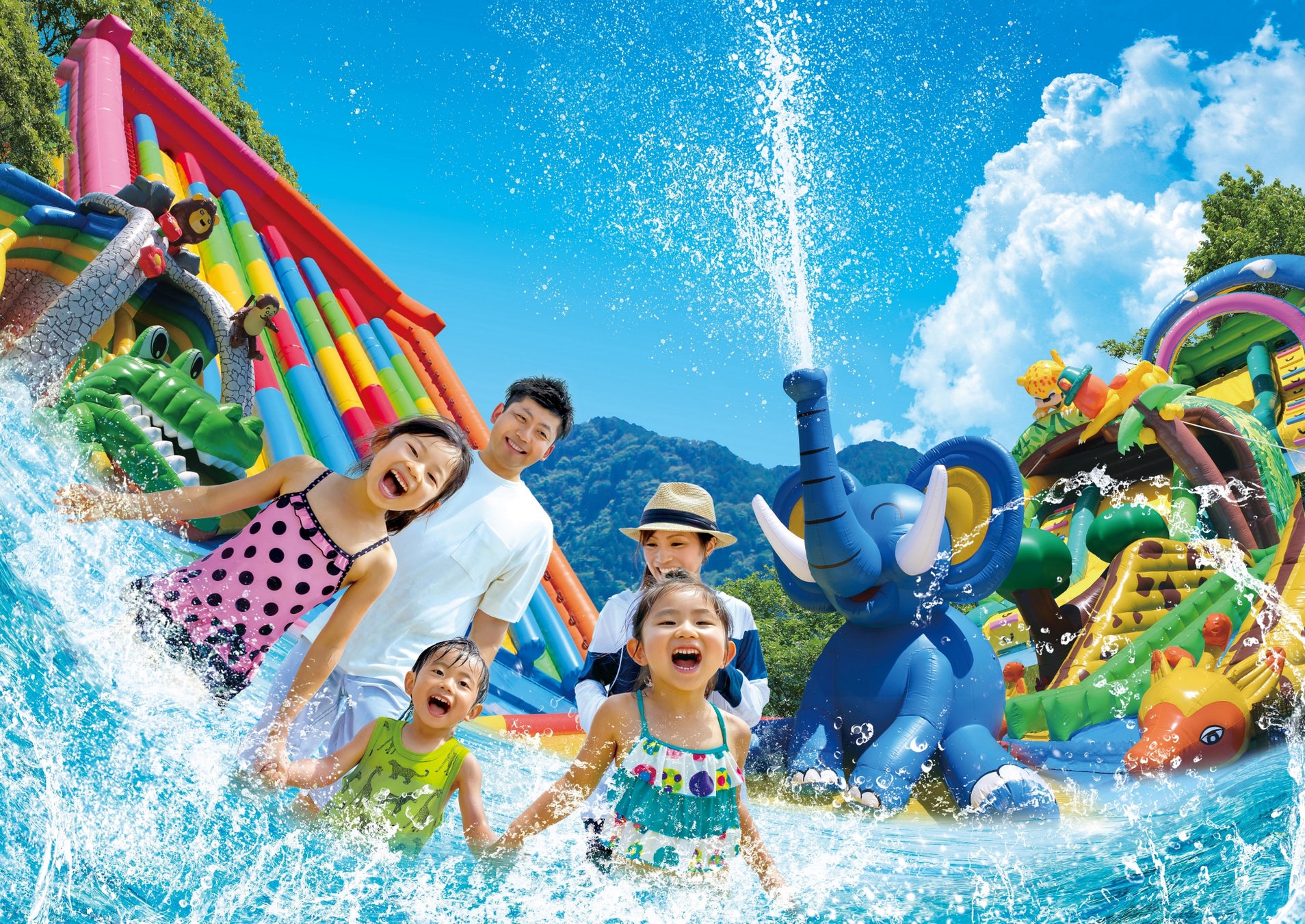 9度目の開催となる今年は、全7種類のジャンボバルーンプールを一新。「わんぱく・アニマル」をコンセプトに「ゾウ」「キリン」「シマウマ」などの動物をかたどったカラフルなバルーンプールやスライダーが新登場します。降り注ぐミストシャワーを浴びながら進む水の迷路「ジャングルメイズ」や、動物たちの影に隠れながらウォーターガンで水の掛け合いができる新エリア「シューティングパラダイス」のほか、長さ15mにもなるロングスライダー、ゾウの鼻から空高く水が噴きあがる「ゾウさんプール」など、ダイナミックな水遊びを楽しめるジャンボプールが勢ぞろいです。