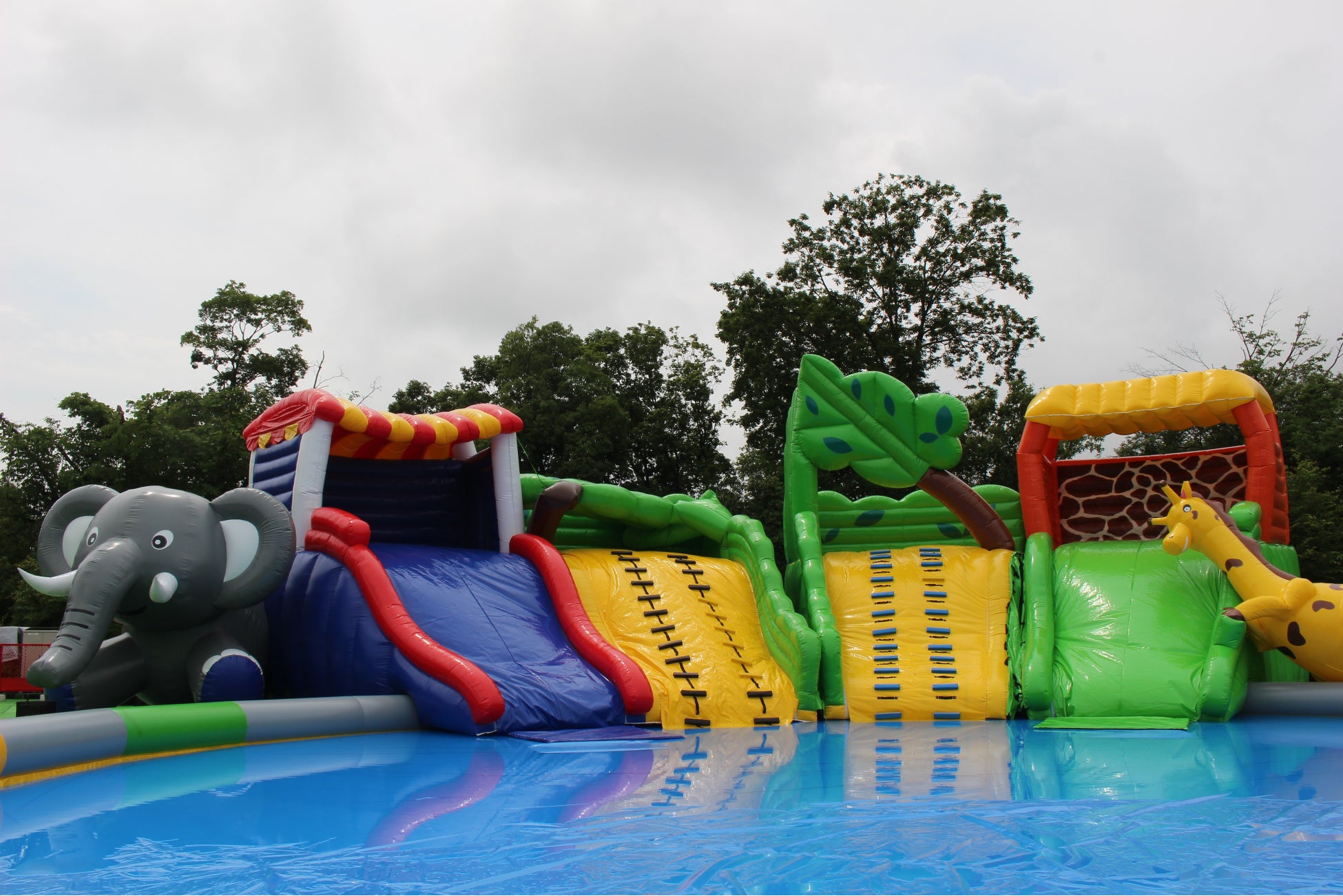 高さ6メートルの、キリンとゾウのスライダーが並んだプール。直径70cm未満の浮き輪を使用できるプールで、小さなお子様でも安心です。