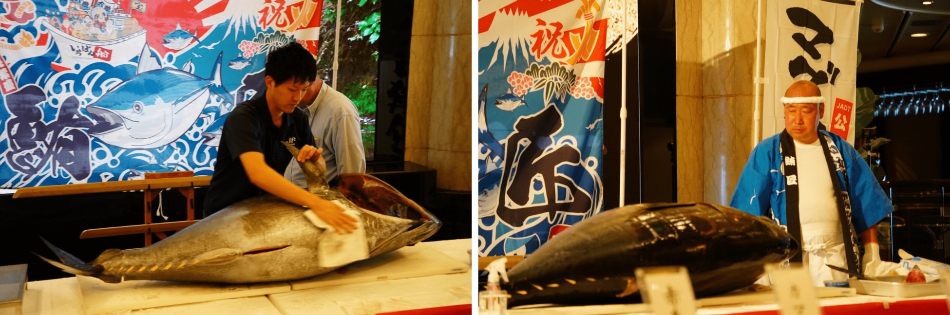 そんなSANKO海商が、次なる挑戦として「出張まぐろの解体ショー」を受注し、豪華客船飛鳥Ⅱからスタートいたしました。今回は「鮪匠」の木村社長とSANKO海商がコラボ出演し、4日間クルーズのメインイベントのひとつとして寄港地和歌山の約100キロの本まぐろが、乗船客の目の前で捌かれました。