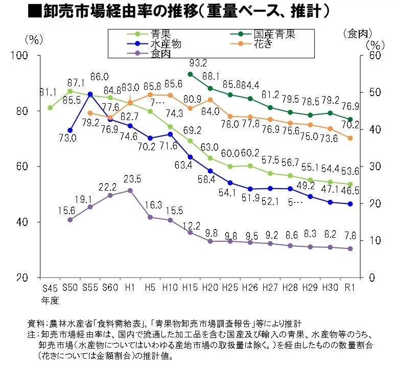 産地・生産者直送などにみられる市場外流通の増加や、卸売市場法改正などにより卸売市場は従来のビジネスモデルからの変換を迫られています。全国的な仲卸業者数の減少は、業界の厳しい局面を如実に表しています。