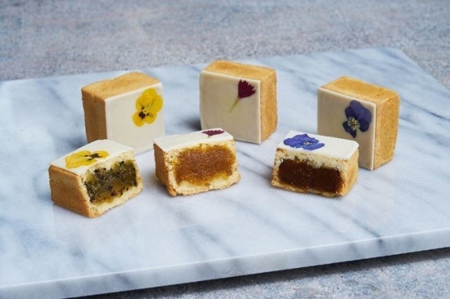 ホワイトチョコレートに飾られた色とりどりのエディブルフラワーがアクセント。ココナッツ風味のクッキー生地でフレッシュフルーツの甘味と酸味を閉じ込めた餡を包みました。