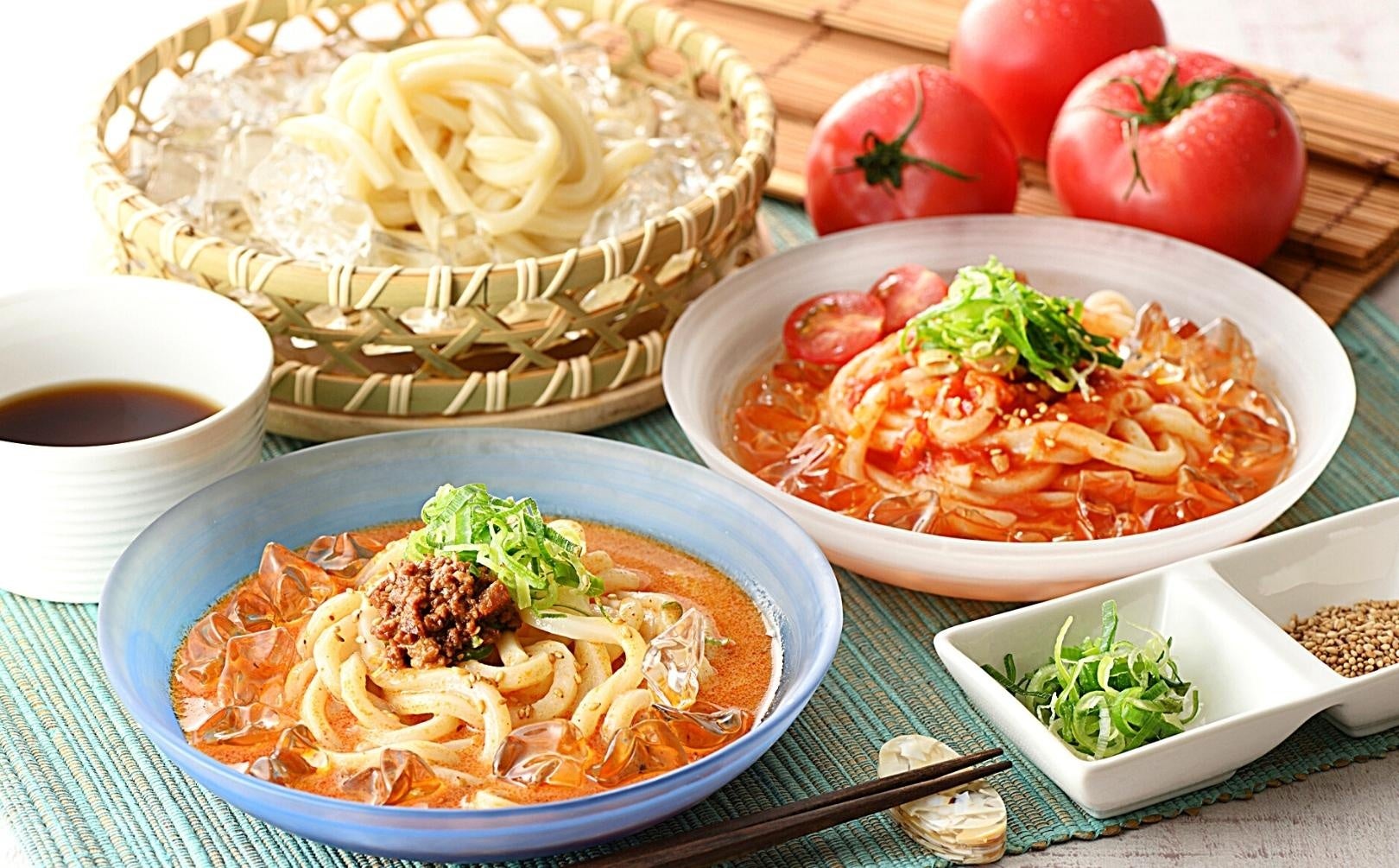 うどんコーナーでは、トマトの酸味と甘みを感じるさわやかな『トマトつゆ』と、山椒ラー油の辛味とゴマダレのコクが癖になる『麻辣胡麻つゆ』の2つの冷たい「つゆ」が登場!もちろん、うどんだけでなく、ラーメンのつけだれにしたり…色々なアレンジもお楽しみいただけます。