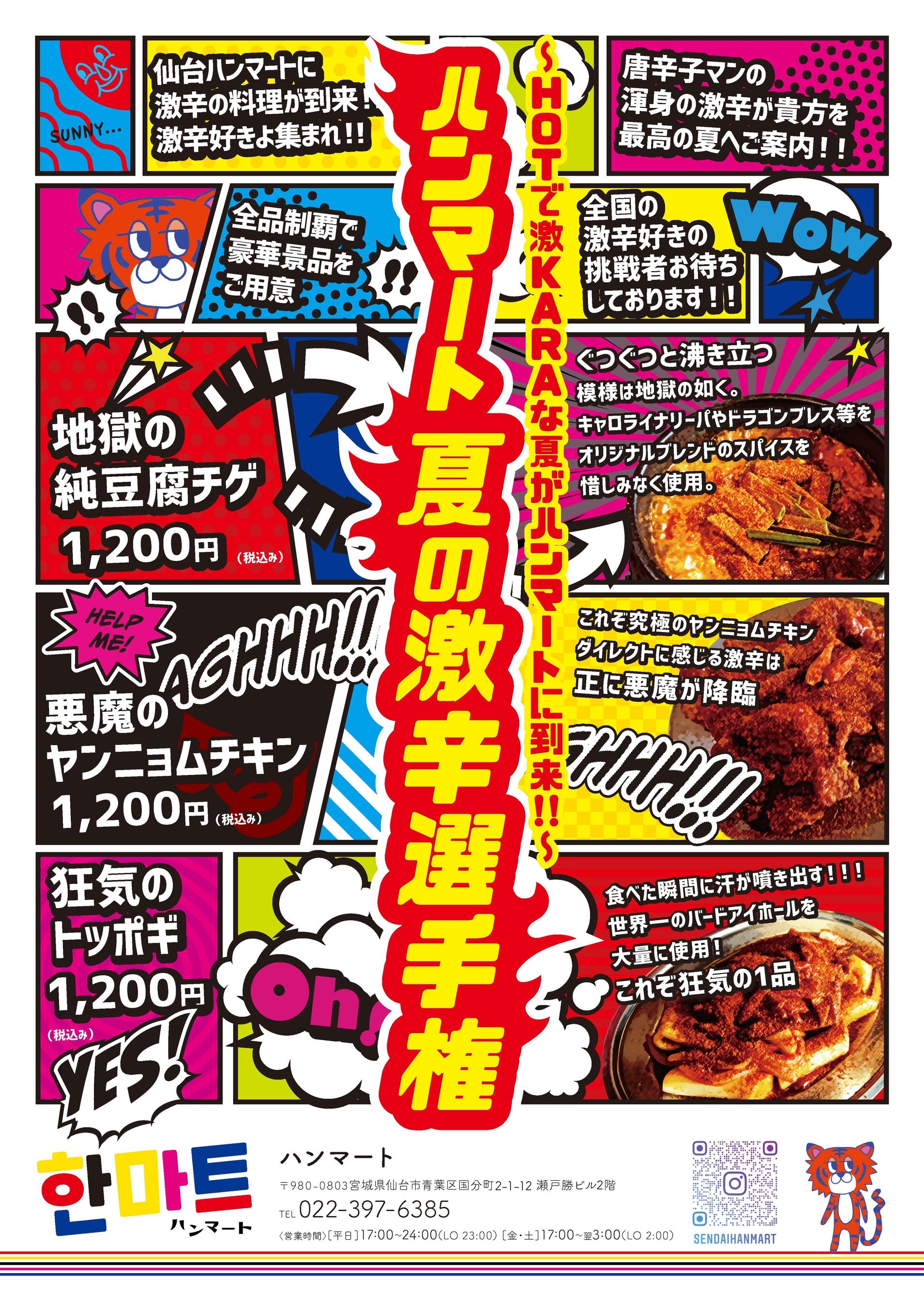 仙台国分町にある韓国料理専門店ハンマートは7月1日~8月31日迄の2ヵ月間、「夏の激辛選手権」を開催致します!1品完食で3000円のお食事券!3品完食で10000円のお食事券がもらえる!!挑戦者求む!