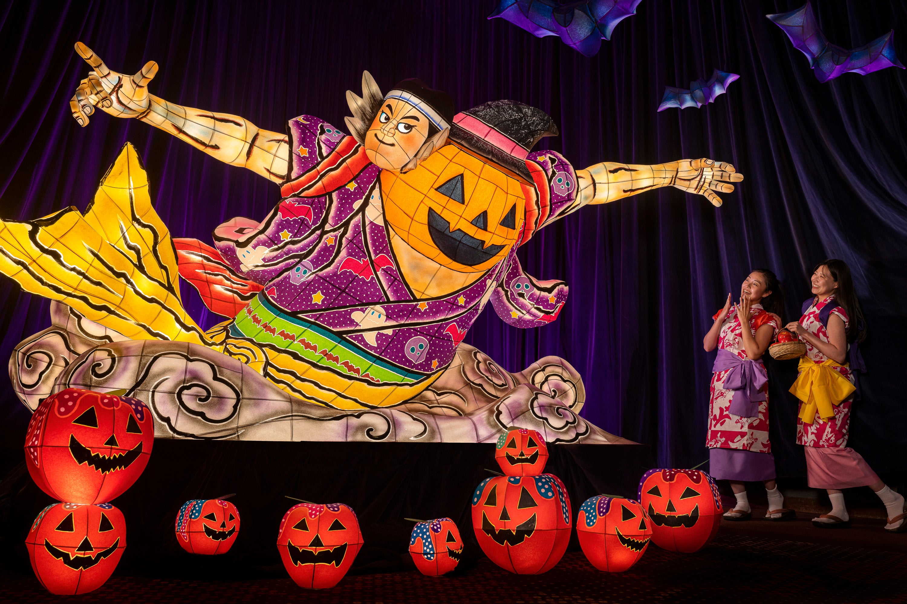 イベントのシンボルとして「ハロウィンねぶた」が登場します。普段は勇ましい表情をしているねぶたが、このイベントではハロウィンらしいデザインの跳人衣装を着て、驚かすポーズをしてお客様を迎えています。また、ねぶたでできたりんごの形の「ジャック・オー・ランタン」や「ねぶたコウモリ」がハロウィンねぶたの周りを囲み、ハロウィンの空間を演出しています。