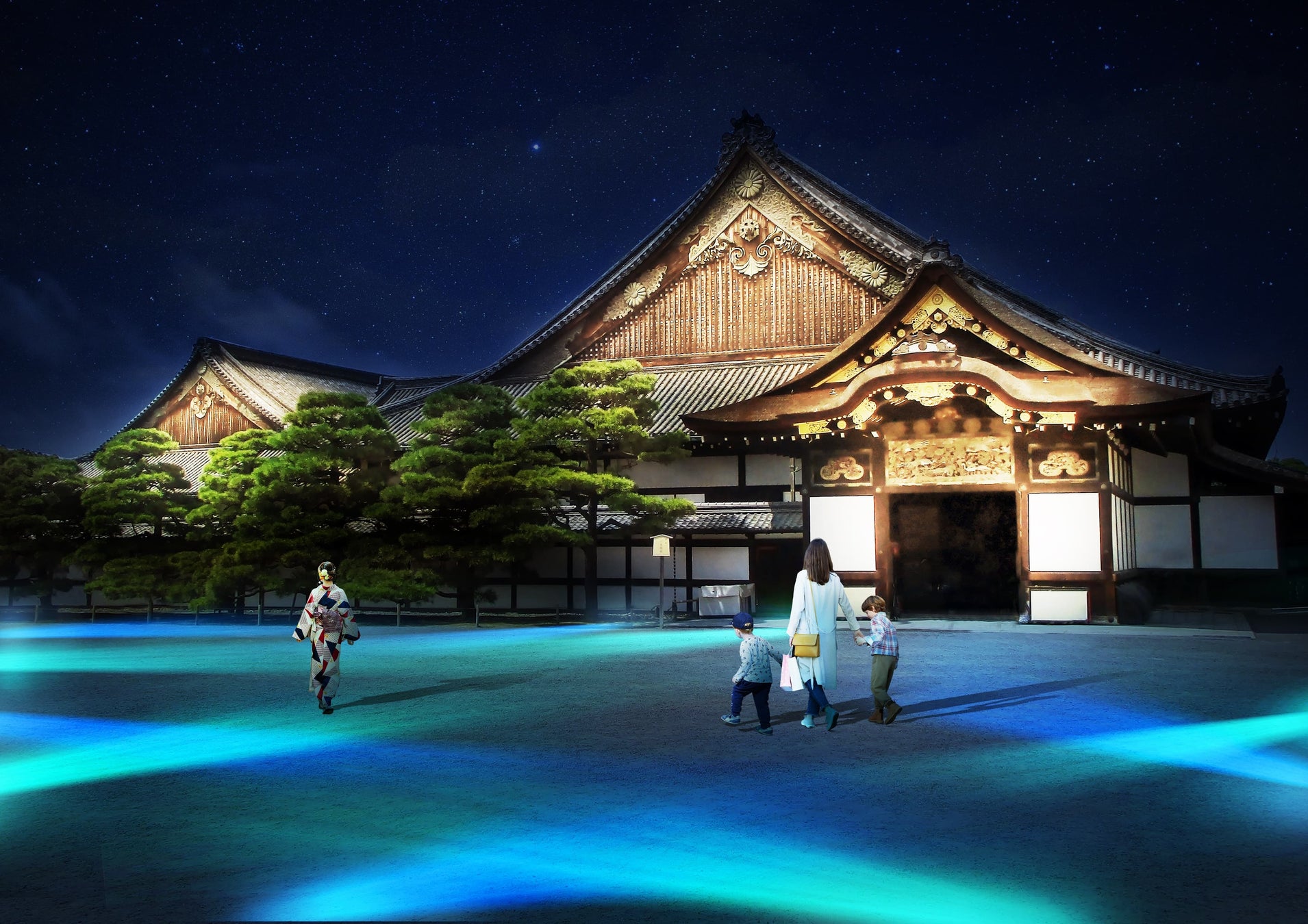 国宝:二の丸御殿ライトアップ二の丸御殿を美しく見せるライトアップに加え、地面には夏らしさと過去と現代が融合する二条城へワープしていくようなブルーカラーのライトアップで皆様を夏の世界に誘います。