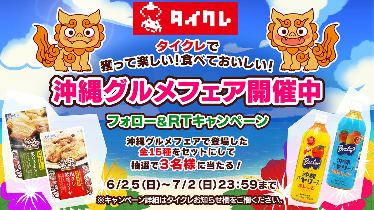 タイクレTwitterアカウントにて、「沖縄グルメ全15種類を全種プレゼント!フォロー&リツイートキャンペーン」を開催いたします。詳細はキャンペーン開始後タイクレ内お知らせ欄をご確認ください。