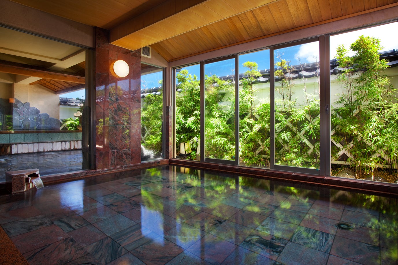 豊富な湯量(毎分300ℓ)を誇る、2本の自家源泉かけ流しの湯は、温泉大浴場や露天風呂、ジェットバスと岩造り、計4ヶ所の貸切風呂(45分2,000円/2022年5月リニューアル)などでご堪能いただけます。