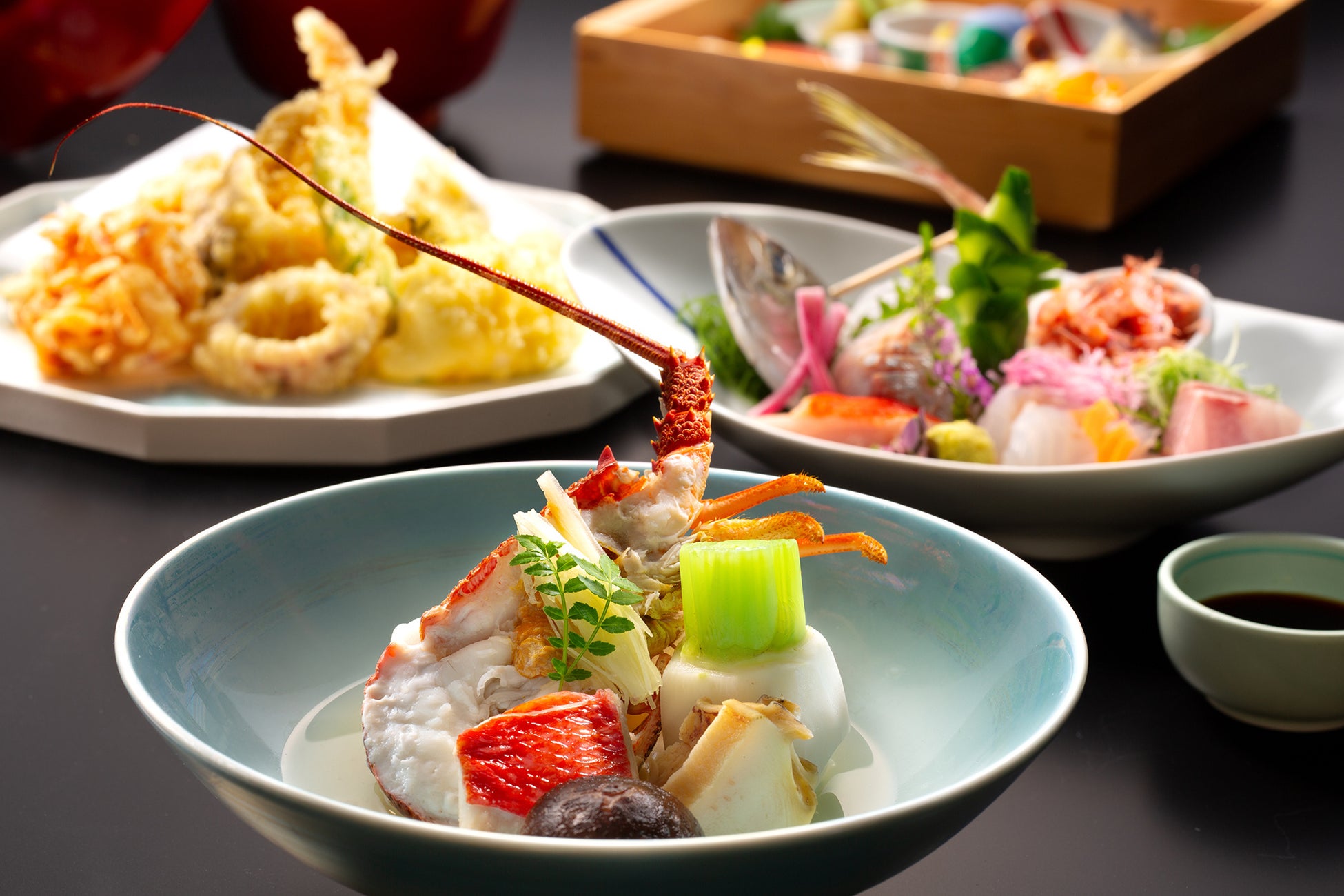 - 伊勢海老・金目鯛・鮑料理と揚げたて天ぷら食べ尽くしの和会席