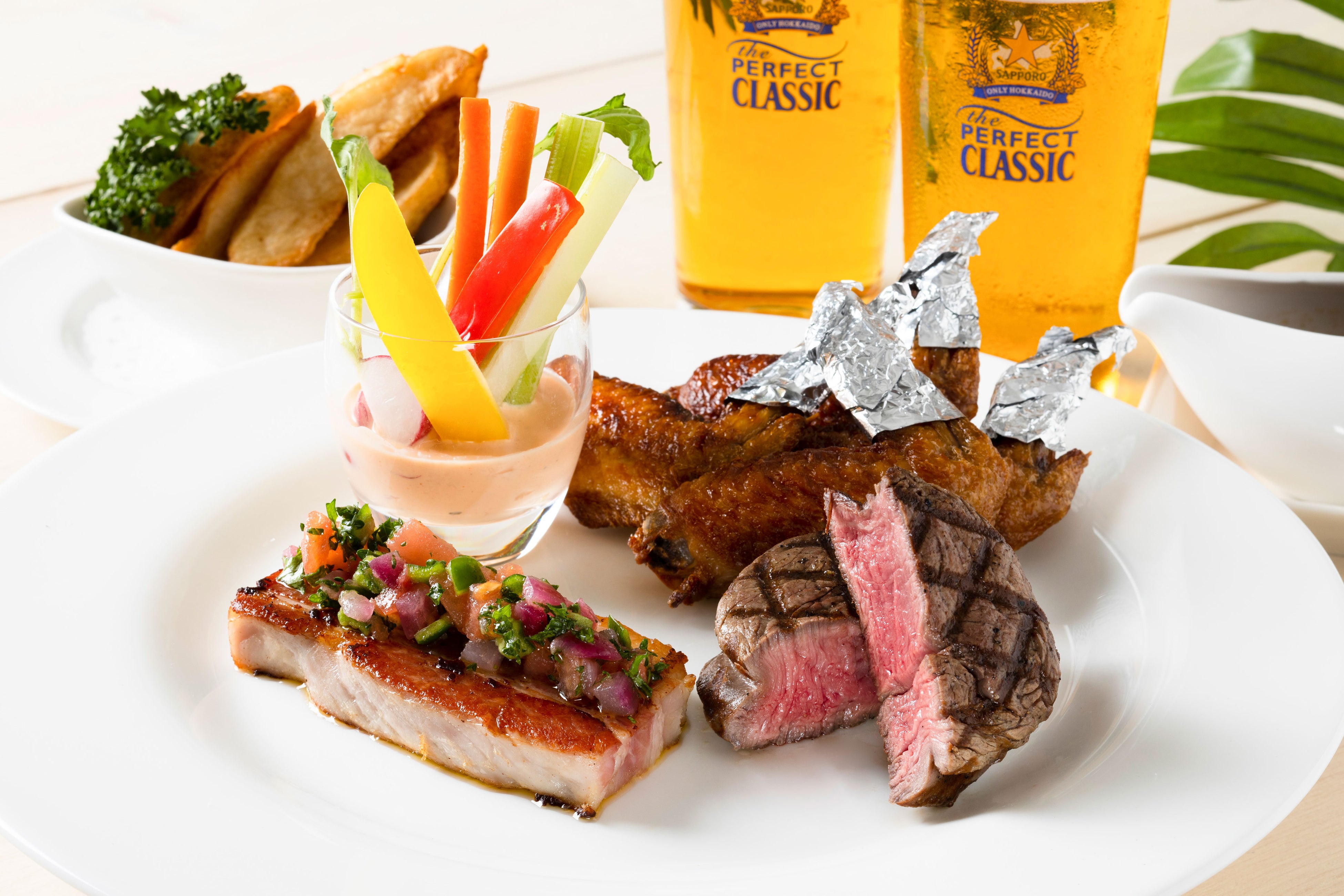 大満足のスリーミートプレートは牛肉のグリル・自家製ベーコン・道産若鳥手羽先をご提供。