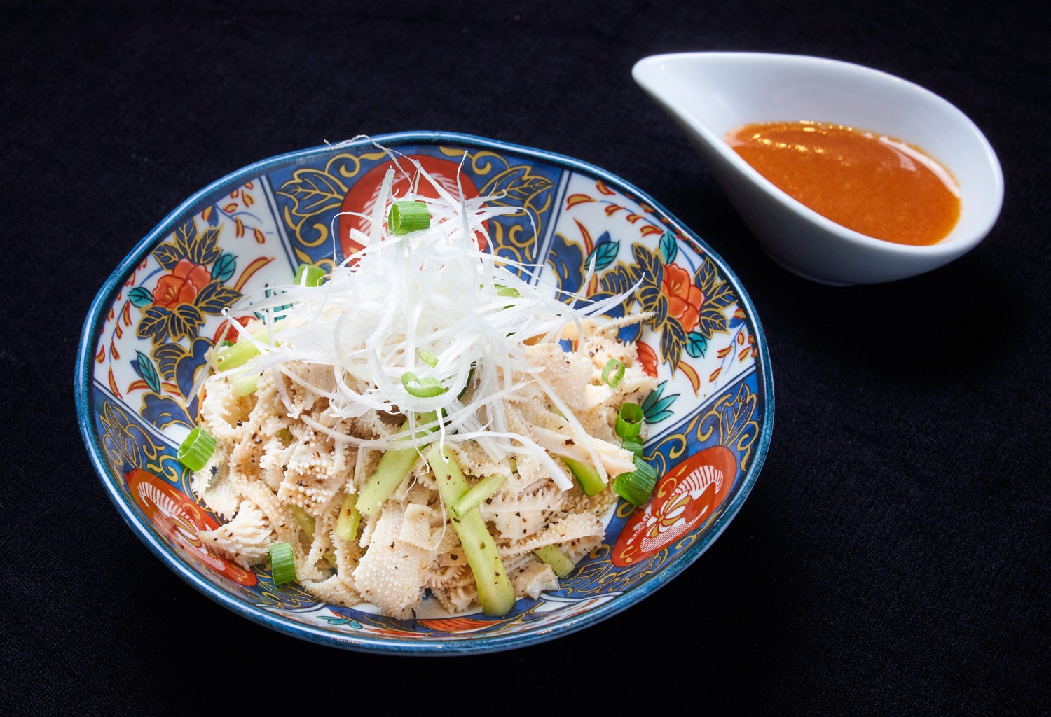 すこし弾力のある、コリコリとした食感が楽しめる白センマイ。くさみや雑味を取り除くため、店舗にて手作業で丁寧に仕込みをしています。あっさりとした淡泊な味わいなので、ピリ辛味噌のタレと合わせてお召し上がりください。