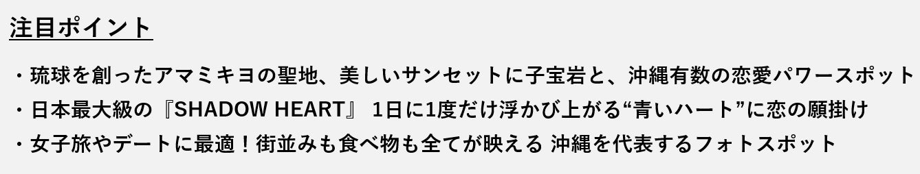 また、瀬長島の南東部には「子宝岩」があり、まだ島民が島に住んでいた時代には子宝祈願に必ず訪れていたとされている「恋の島」でもあります。マスクなしの夏が来るこの梅雨明けに合わせて、太陽とともに影の形が変わり、1日に1度だけ⻘いハートの影が映し出される“恋のおまじない”『SHADOW HEART』が登場します。