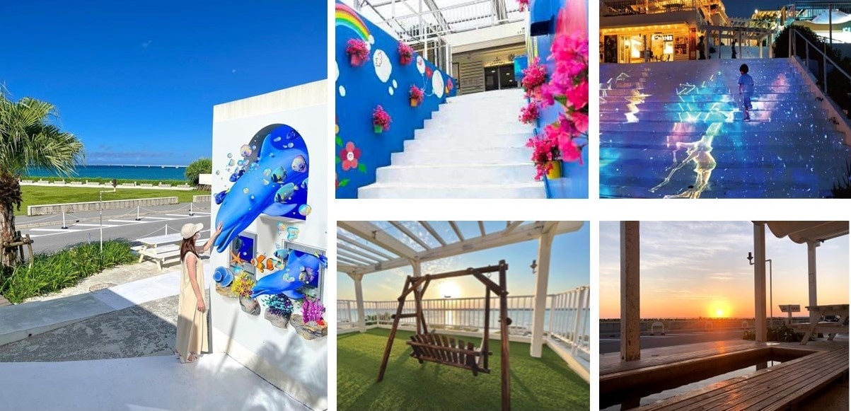左斜め後方から撮影すると、イルカが飛び出しているように見えるトリックアート『幸せを呼ぶイルカ』や、真っ青な壁と豊見城市花のブーゲンビリアで彩られた鮮やかな幸せを呼び込む空間『ブーゲンビリアの階段』など、様々な映えるフォトスポットが集まる瀬長島ウミカジテラス。