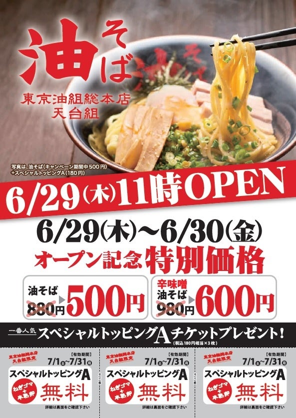今回、オープンを記念し、2023年6月29日(木)、30日(金)の2日間、「油そば」 500円(税込)、「辛味噌そば」 600円(税込)でお召し上がりいただける、“オープン記念キャンペーン” を実施いたします!※並盛り・大盛り・W盛り全て同一価格(東京油組総本店 天台組のみで実施)