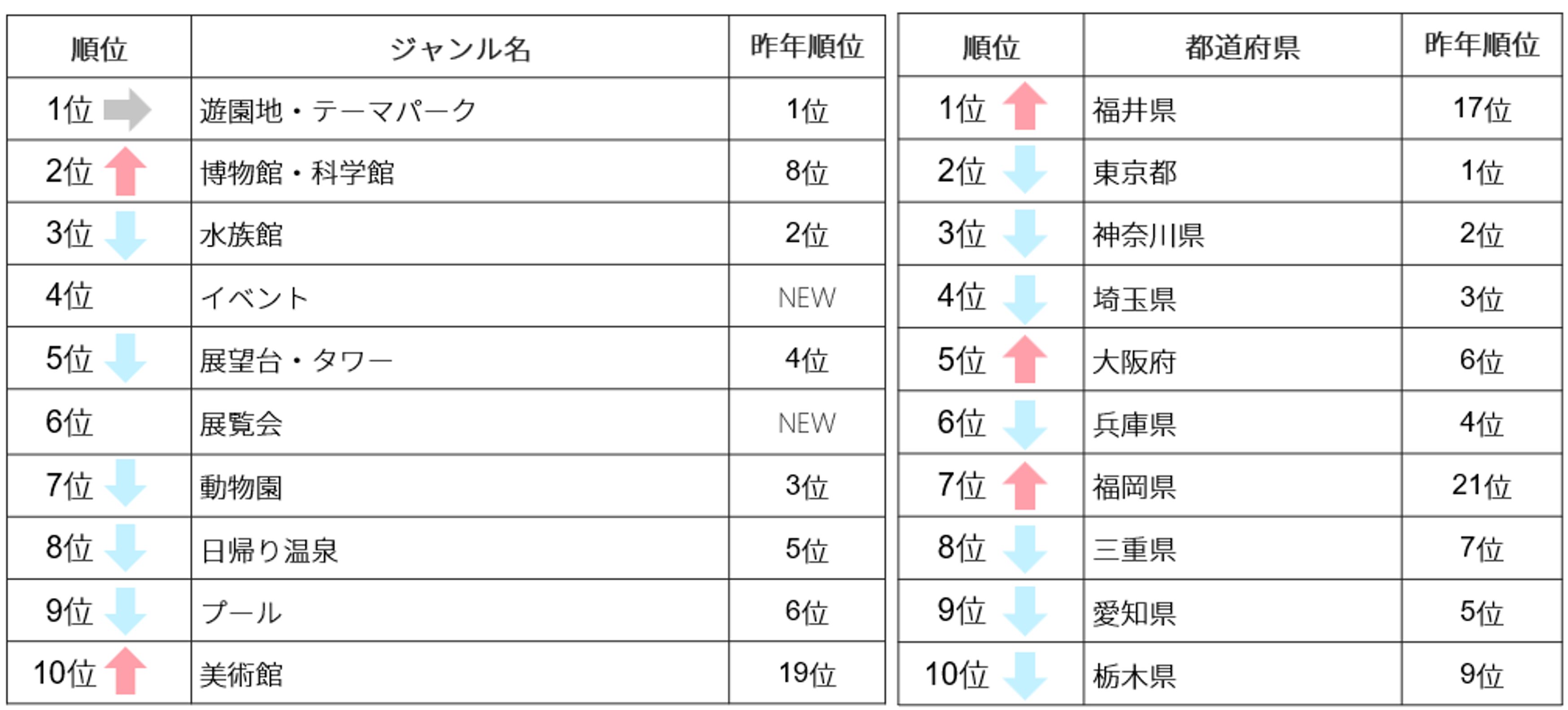 - 昨年17位の福井県が1位に。7/1に「芝政ワールド」夏季限定プールのオープン、7/14に世界三大恐竜博物館「福井県立恐竜博物館」のリニューアルオープンを控えていることで注目を集めている。