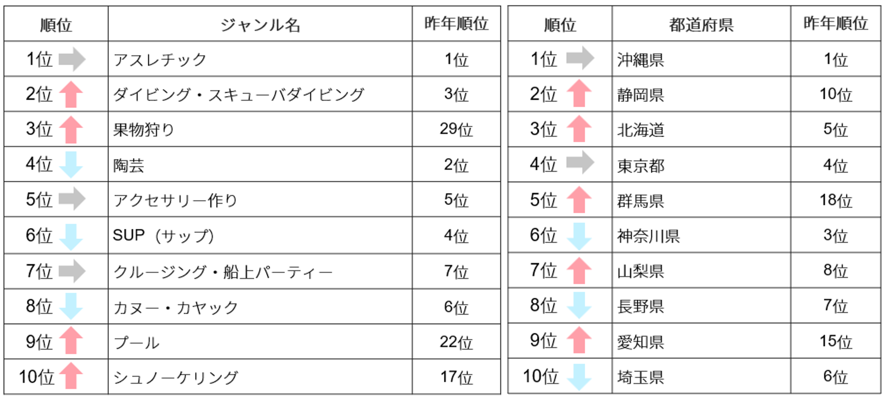 - 海・川・湖などで体験できるウォーターアクティビティが上位5位を独占。