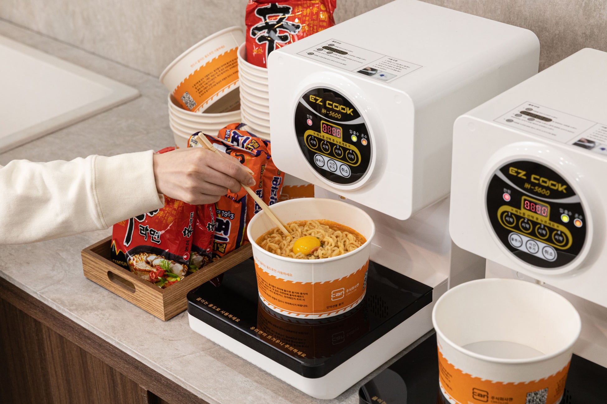 店内では計12種の人気のカップ麺・袋麺商品も販売します。店内にはポット以外にも、韓国で定番となっているインスタントラーメンの自動調理機があり、袋麺もその場で美味しく食べられます。この機械はただお湯を注ぐだけでなく、下側のIHによって、麺やスープをぐつぐつ“煮込む”ことで、よりスープが麺に染み込んだ、本場韓国のラーメンの味を再現してくれます。