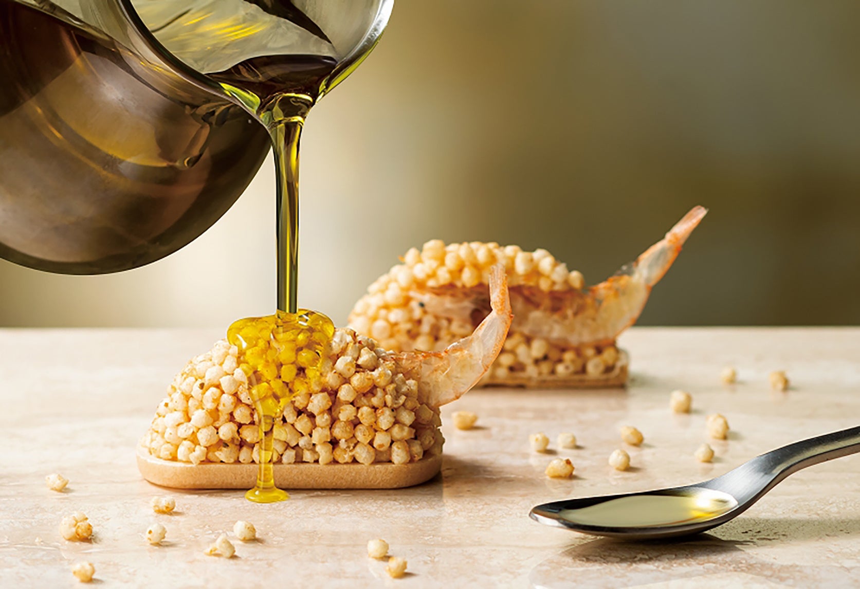 富山湾の宝石「しろえび」を、富山米100%の生地にたっぷりと練りこみました。パリッとした食感の塩味ベースのしろえびせんべいをオリーブオイルとほのかな酸味で上品な味に調えました。