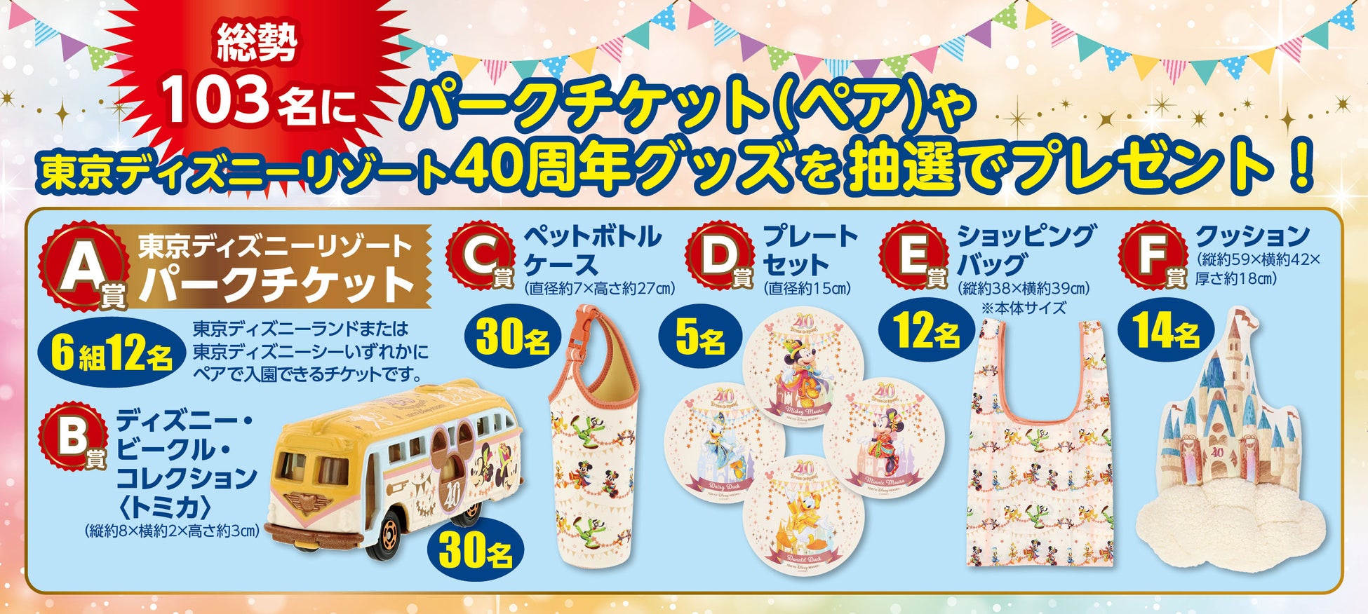 - パークチケット(ペア)や東京ディズニーリゾート40周年グッズなど、合計103名に当たるプレゼントキャンペーン実施中!