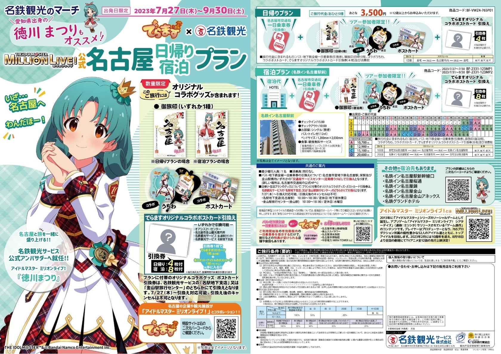 愛知県出身の徳川まつりもオススメ!!アイドルマスター ミリオンライブ!公式日帰り・宿泊プランを名鉄観光サービスで発売中。このプランでしか手に入らないオリジナルコラボグッズやバス・地下鉄全線一日乗車券付。(※先着2,000名までは「でらます×名古屋市交通局」バス・地下鉄全線一日乗車券のコラボ乗車券が付きます。)