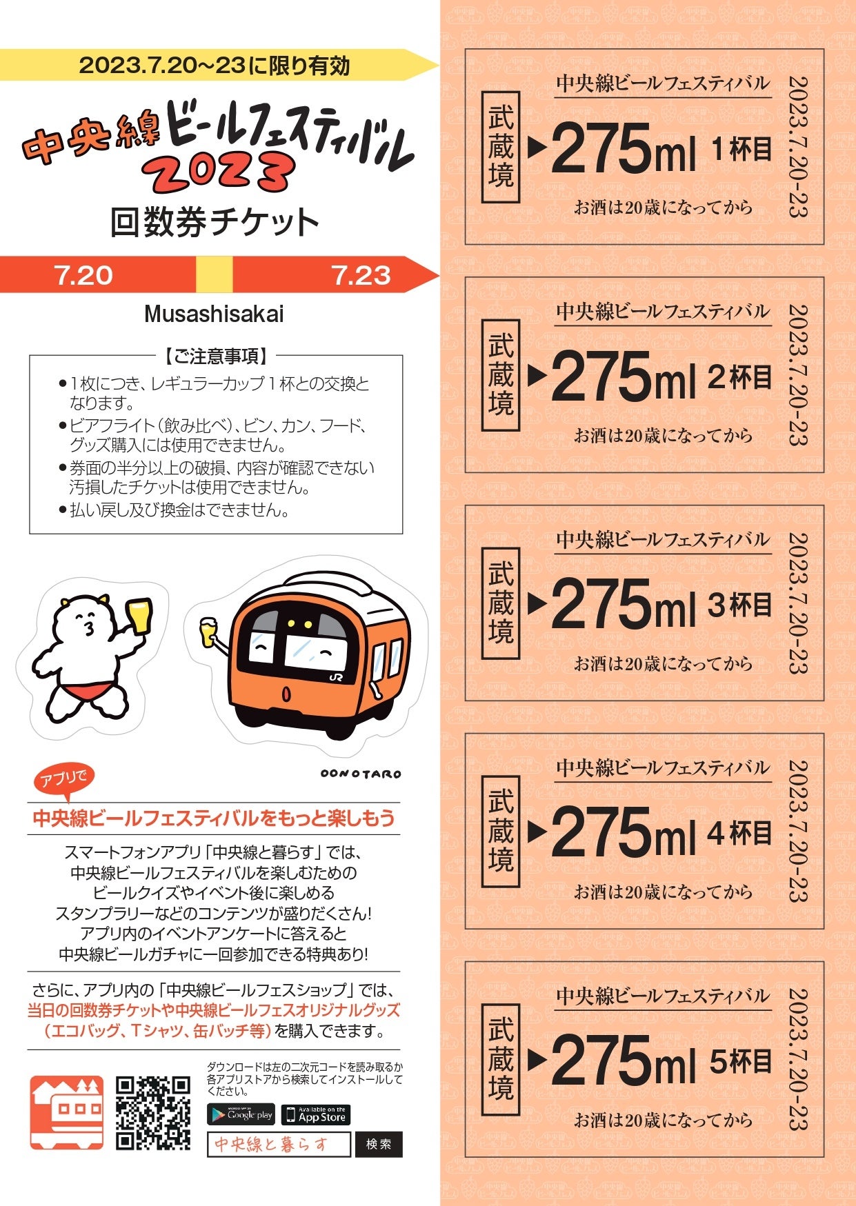 ◎発売価格:税込3,000 円/5 杯分【限定600 枚・なくなり次第終了】 ◎発売サイト:「中央線フェスティバルショップ」 ・JRE MALL サイト( https://www.jreastmall.com/shop/c/c79/ ) ・中央線と暮らすアプリ( https://yappli.plus/chuosenlife_beer ) ◎発売期間:2023 年7 月4 日(火)14 時~7 月19 日(水)18 時まで販売予定 ◎受取方法:以下受取箇所にて購入画面をご提示いただくと、ビール引換回数券を受け取れます。 ※受取箇所は期間によって異なります。 ・2023 年7 月4 日(火)~7 月19 日(水):JR 武蔵境駅有人改札にて ※JR東日本のBeyond Stations 構想「駅の受取拠点化」の実証の一環にて実施します。 ※お受け取りにはご購入時のスマートフォンをお持ちください。 ※輸送障害発生の際などには、お待ちいただく場合もございます。 ・2023 年7 月20 日(木)~7 月23 日(日):メイン会場内受付にて ◎購入特典:フェス当日に、特設ブースにてお帰りの際に使用できる乗車券を受け取れます。(上記参照) |