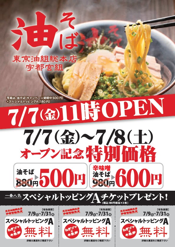 今回、オープンを記念し、2023年7月7日(金)、8日(土)の2日間、「油そば」 500円(税込)、「辛味噌そば」 600円(税込)でお召し上がりいただける、“オープン記念キャンペーン” を実施いたします!※並盛り・大盛り・W盛り全て同一価格(東京油組総本店 宇都宮組のみで実施)