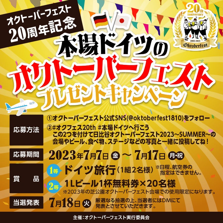 今年は 20 周年を迎える本実行委員会にとって今後もさらに多くの方々にドイツビールの美味しさ、オクトーバーフェストの楽しさを体験していただきたく、ドイツオクトーバーフェストご招待キャンペーンを実施する事と致しました。