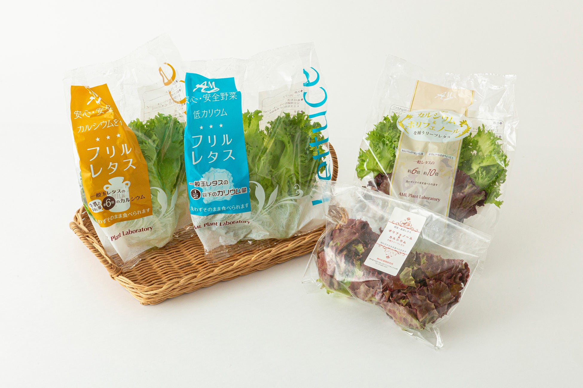 完全閉鎖型植物工場で徹底した環境管理の下、独自の栽培技術を用いて開発した高機能性野菜です。牛乳と同量のカルシウムを含む「Ca-リッチレタス」、ワインの1.3倍のポリフェノールを含む「ポリフェノール-リッチレタス」、カリウム摂取制限のある方にはカリウムを一般レタスの50%以上カットした「低カリウムレタス」の3種展開です。