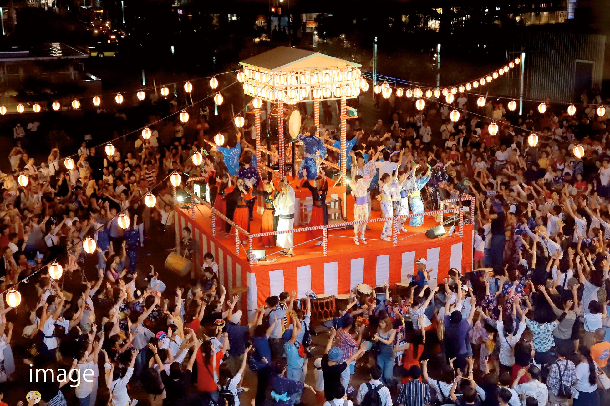 大きなやぐらを舞台にみんな一緒に輪となって盆踊りを楽しもう!