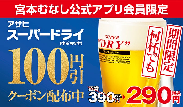 ■ 宮本むなし公式アプリ会員様限定「生ビール100円引きキャンペーン」を開催!