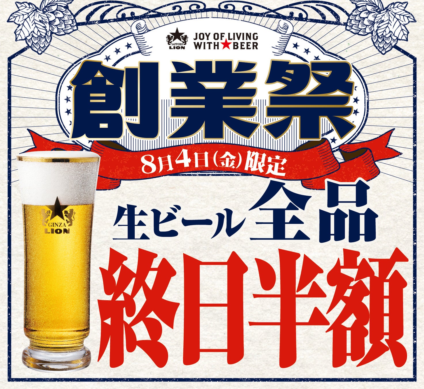 創業日8月4日(金)当日に限り、全国のサッポロライオンチェーン(一部店舗を除く)において、取扱いのある生ビール全品を終日半額にてご提供します。