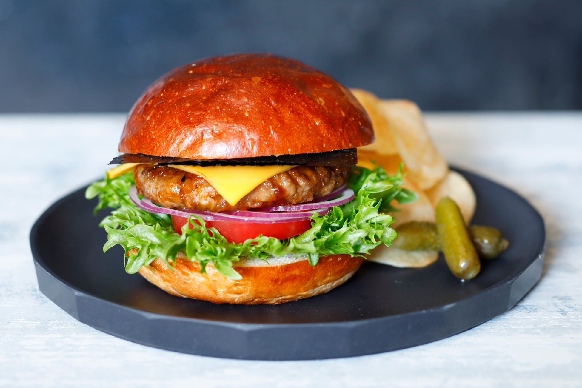 レタス・トマト・オニオンの上に、てりやき風味のビーフパティ、チェダーチーズと海苔が絶妙に絡み合う、不動の人気を誇る看板バーガー。