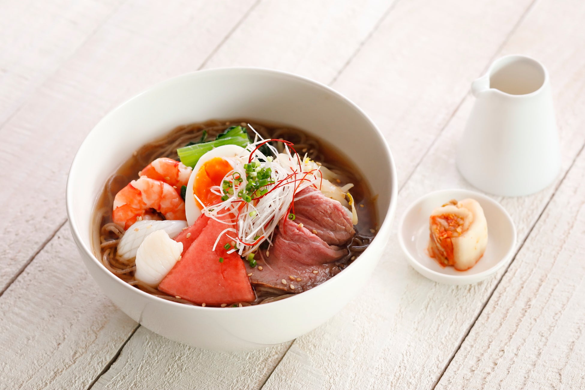 ローストビーフに海老、イカの海鮮素材を盛り込み、夏の風物詩・スイカもアクセントとして加わった韓国風冷麺。本場韓国のどんぐり粉入りの麺を使用した本格派です。セットのキムチをお好みで加えてお召し上がりください。