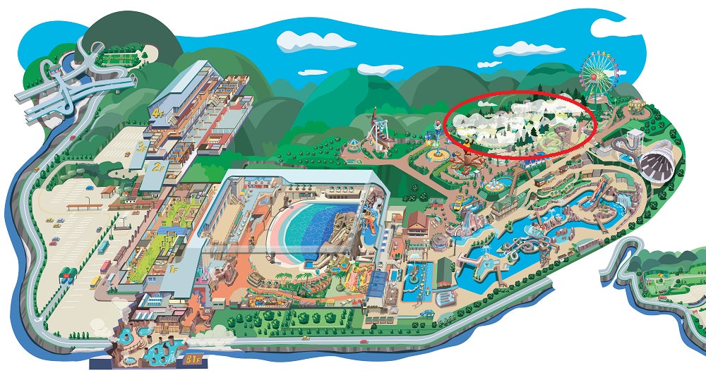 「MONSTER STREAM」の計画地は、起伏のある東京サマーランドの地形の中でも山側に位置しており、森に囲まれた緑豊かな環境の中にあります。
