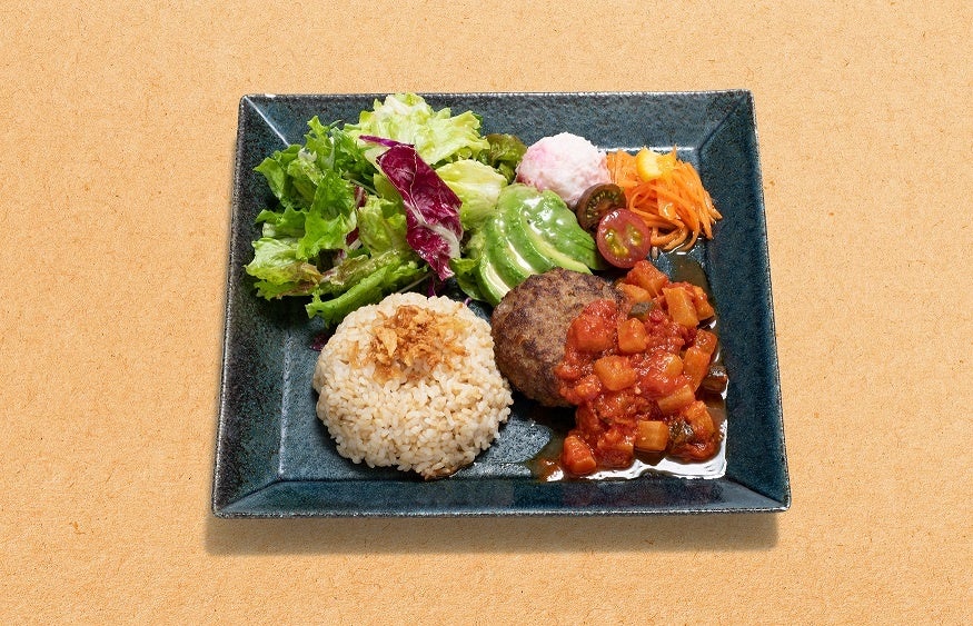 ジューシーで食べ応えのあるアンガス牛100%のハンバーグに、青木農園の夏野菜をスパイシーに仕上げたラタトゥイユを添えて。