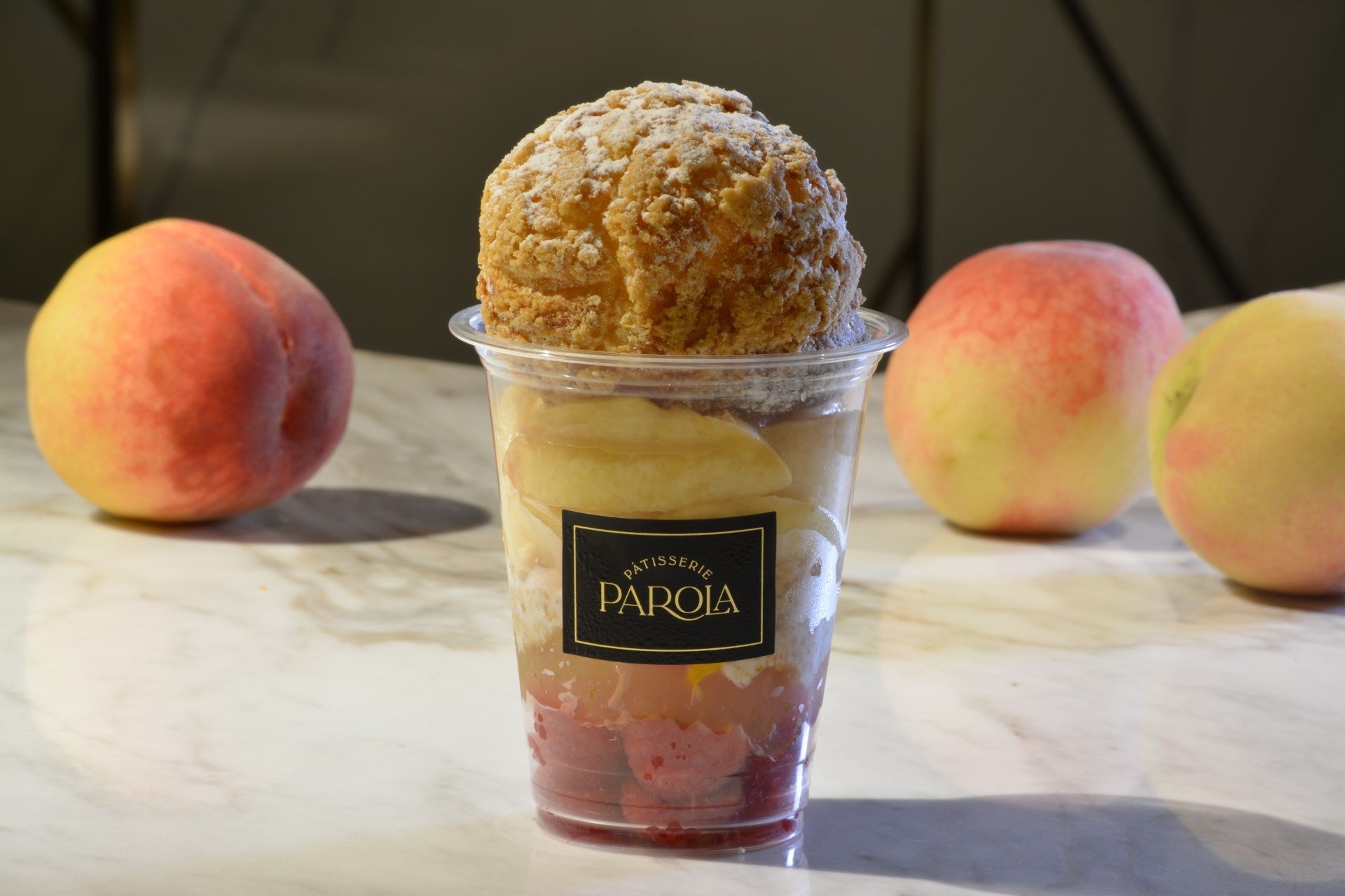 フランスと日本文化の融合をテーマにした、東京・日比谷と東京スカイツリーに店舗を持つ<パティスリー・パロラ>からは、桃とシュークリームを組み合わせた独創的なパフェが登場。ミルクの風味豊かなクリームに、シュー生地と甘く香り高い桃がふんだんに盛り付けられています。フランス産発酵バターを贅沢に使用したザクザク食感の生地が、とろりとしたクリーム、みずみずしい桃の果肉とベストマッチ! 見た目はボリューミーながらも、ペロリといただける一品です。