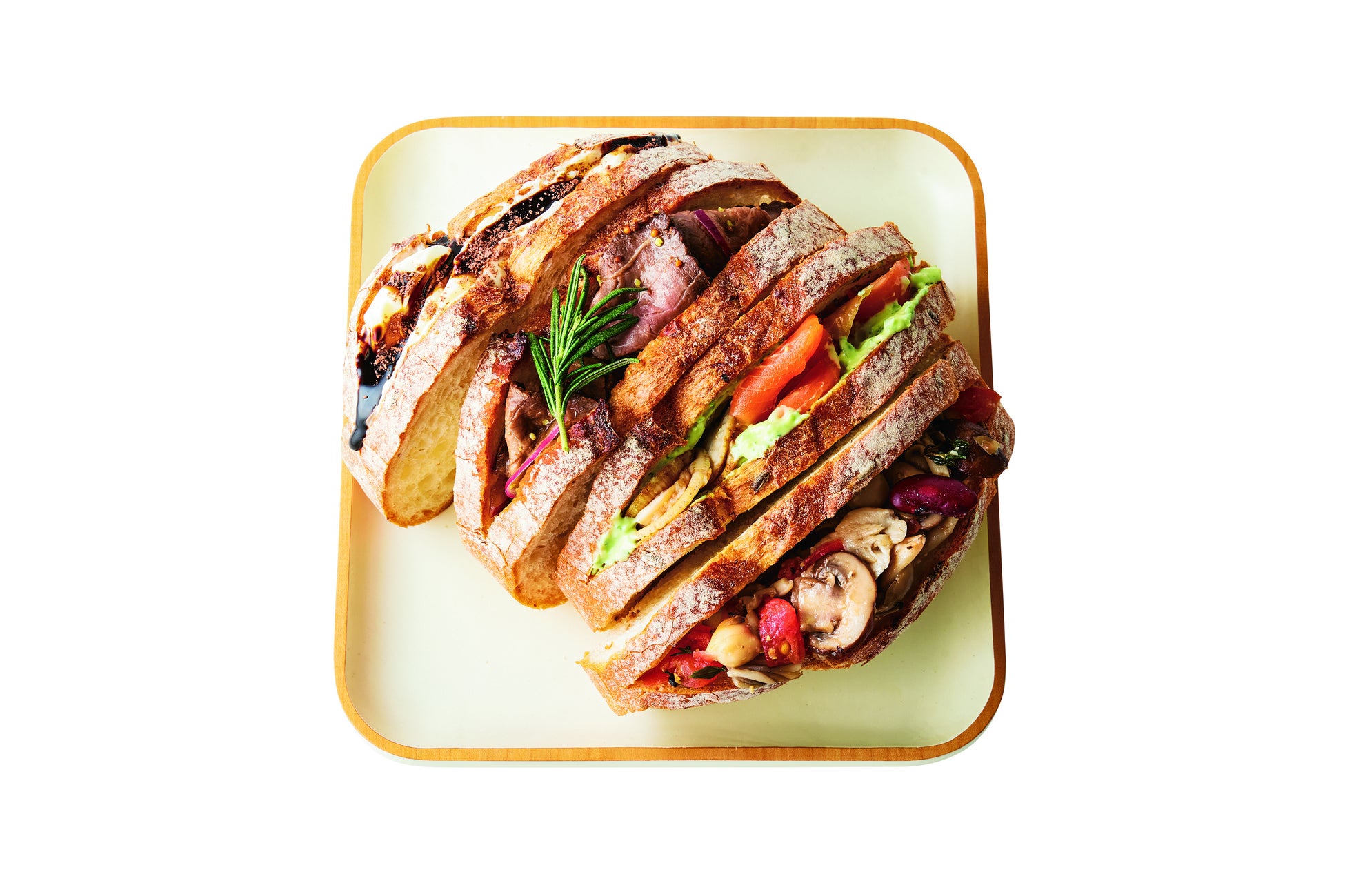 東京・中目黒の燻製ダイニング<中目黒 燻製アパートメント>のサンドイッチセットは、フランス料理のコースをイメージした豪華仕様。前菜から魚・肉料理、デザートまでをカンパーニュサンドで味わえます。「きのことトマトのマリネ」「スモークサーモンとホタテのエスカルゴソース仕立て」「燻製ローストビーフ/燻製パテドカンパーニュ/燻製チキンのタプナードソース仕立て(いずれか1種)」「ティラミス」の順で食べ進めれば、まるでフルコースのような満足感をお楽しみいただけます。