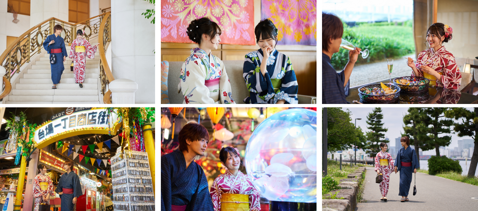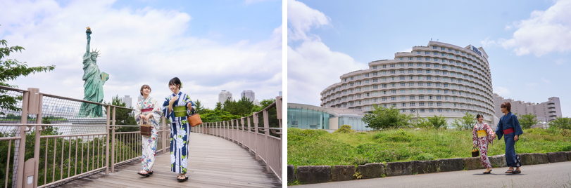 また、お台場は浴衣でのまち歩きにも最適で、デックス東京ビーチにあるレトロな雰囲気が魅力の施設 「お台場一丁目商店街」やアクアシティお台場にある和の空間「GA☆KYO アクアリウム DAIBA TOKYO」、レインボーブリッジ、自由の女神像など、カップルやご友人同士で存分にお楽しみいただけます。 魅力的なお台場エリアを浴衣で楽しむことができる貴重な体験をぜひこの機会にご利用ください。