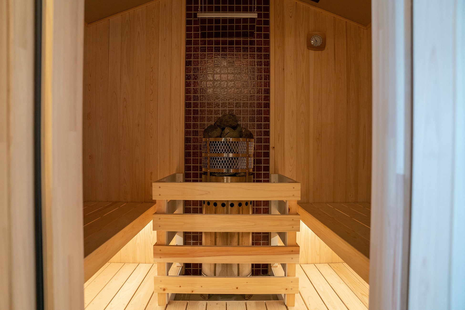 窓を開放して半露天としてもご利用いただける専用露天風呂のあるバスエリアには、独立したシャワーブースの他、プライベートサウナと水風呂、さらに外気浴コーナーをご用意いたしました。水風呂には、鋸山の伏流水による肌にやさしい天然水を使用。潮騒の音色にも癒される外気浴デッキで海辺のアーバンライフ楽しむラグジュアリーな「ととのう」をご体感ください。バスエリアのすべての設備はリビングからウォークスルーでご利用いただける造りとなっております。